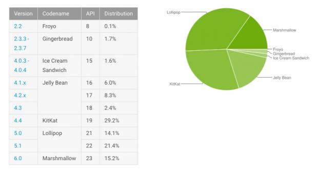 Như những gì mà biểu đồ bên dưới cho thấy, Android đang ngày càng bị phân mảnh nghiêm trọng hơn. Tính tới ngày 1/8 vừa qua, chỉ có 15.2% người dùng Android sử dụng phiên bản 6.0 Marshmallow, tăng gấp đôi kể từ tháng 5/2016 ( 7.5%). Tuy có tăng trưởng, nhưng con số tổng vẫn còn quá bé nhỏ cho một phiên bản Android đã ra mắt được 10 tháng với nhiều cải tiến.