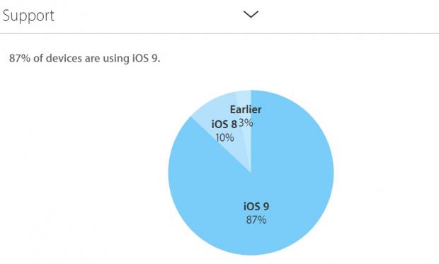 Theo thông tin mà trang Developer của Apple đăng tải, tính tới ngày 15/8, 87% người dùng thiết bị di động của Apple đã cập nhật lên phiên bản iOS 9. 10% vẫn gắn bó với iOS 8 ra mắt năm 2014 và chỉ 3% còn sử dụng những phiên bản iOS cũ hơn.