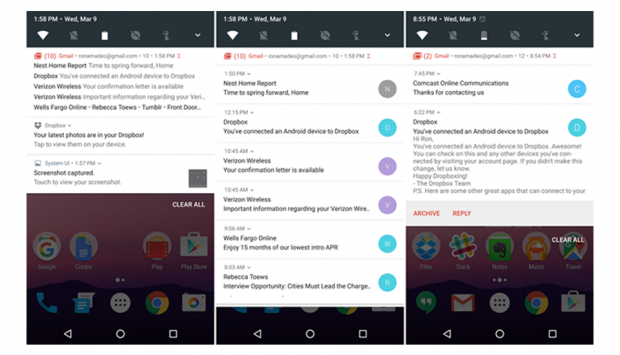 Nhóm các thông báo cùng ứng dụng thành một mục là tính năng đáng giá tiếp theo trên Android 7.0 Nougat. Thay vì đẩy rất nhiều thông báo riêng lẻ cùng một ứng dụng như trước, tạo thành một mớ hỗn độn, nay thanh thông báo hoạt động thân thiện hơn, gọn gàng hơn. Như hình ảnh phía trên, chúng ta có thể thấy rằng ứng dụng Gmail đang có rất nhiều thư mới, tuy nhiên chúng sẽ được nhóm lại ở dạng như “10 New Messages” và hiển thị ngắn gọn nội dung của mỗi email. Khi cần xem chi tiết, người dùng chỉ cần nhấn vào để Nougat hiển thị toàn bộ nội dung, đồng thời có thể vuốt tay sang các bên để xóa nhanh thông báo, mở rộng tin nhắn để hệ thống hiển thị nút “Lưu trữ/Trả lời”.