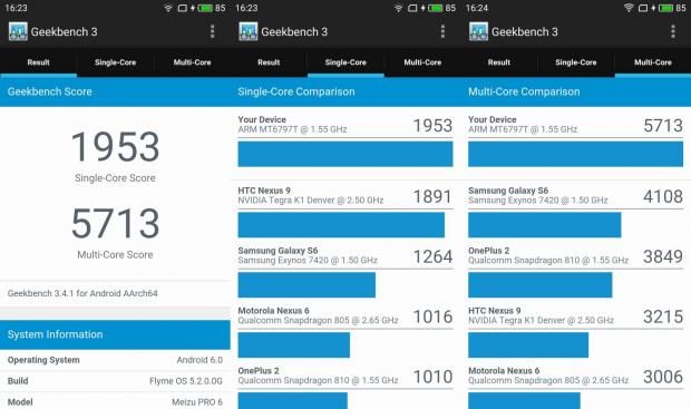 Tiếp đến, ta sẽ dùng ứng dụng Geekbench 3 để đo hiệu năng xử lý đơn nhân và đa nhân. Trong phép thử này, Meizu PRO 6 đạt 1953 điểm đơn nhân và 5713 điểm đa nhân, con số rất cao. Như mình đã nói, vi xử lý của MediaTek sinh ra để thống trị thị trường về mặt CPU.
