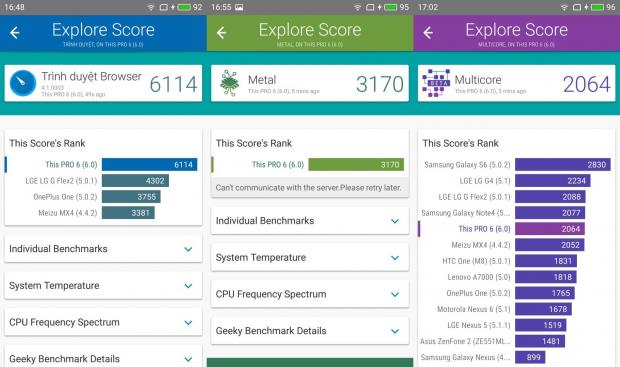 Tiếp tục với ứng dụng Vellamo để đo sức mạnh của trình duyệt, đo sức mạnh xử lý đơn nhân và đa nhân thì chiếc điện thoại Meizu PRO 6 đạt được số điểm lần lượt là 6114, 3170 và 2064 điểm. Thực tế mình cũng không rõ lý do vì sao điểm đa nhân của Meizu PRO 6 trong bài đánh giá này lại thấp như vậy? Có lẽ là do phép thử này trên Vellamo vẫn còn ở dạng Beta.