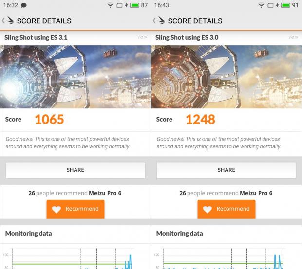 Cuối cùng là ứng dụng 3DMark để đo hiệu năng xử lý đồ hoạ 3D. Bất ngờ, Meizu PRO 6 đạt được điểm số 1065 với phép thử ES 3.1 và 1248 với phép thử ES 3.0. Theo đánh giá từ phần mềm 3DMark thì điện thoại Meizu PRO 6 là một trong những thiết bị mạnh mẽ nhất trên thị trường hiện nay. Tuy nhiên, vẫn cần đánh giá thực tế với một số trò chơi ở dưới đây.