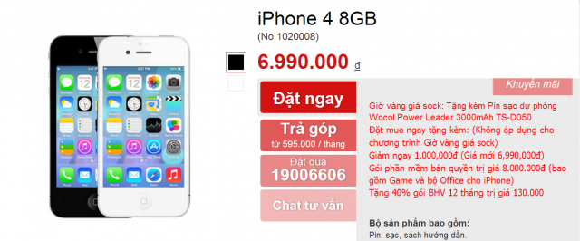 Vừa qua hệ thống đã bất ngờ giảm giá chỉ còn 6,99 triệu đồng cho iPhone 4 phiên bản 8GB chính hãng.máy được cài sẵn hệ điều hành iOS6.
