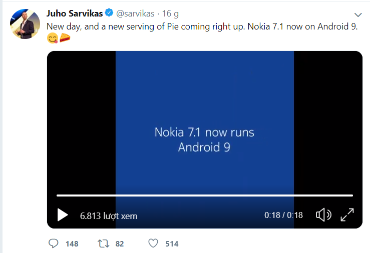 Tin tức này được Juho Sarvikas - Giám đốc sản phẩm của HMD Global đăng tải trên Twitter cá nhân. Nokia 7.1 là một thiết bị chạy trên Android One - nền tảng hệ điều hành thuần Google. Được biết HMD Global đã thử nghiệm Android Pie cho chiếc Nokia 7.1 từ tháng 10.