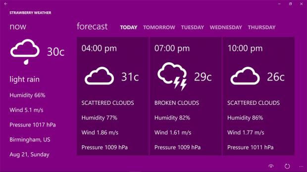 Với Strawberry Weather, mỗi chủ đề thời tiết được hiển thị với 1 màu sắc đặc trưng. Ngoài khả năng cung cấp các thông tin về thời tiết tại 'vị trí' người dùng thì ứng dụng còn có thể hiển thị thông tin đó lên Live Tile và màn hình khóa.