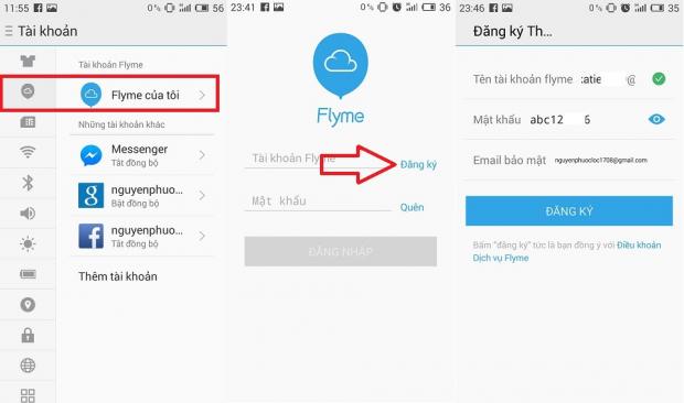 Đầu tiên, các bạn vào Cài đặt, tìm đến mục Tài khoản, tại đây lựa chọn vào phần Flyme của tôi. Giao diện đăng nhập hiện ra, các bạn tiếp tục chọn vào phần Đăng kí.