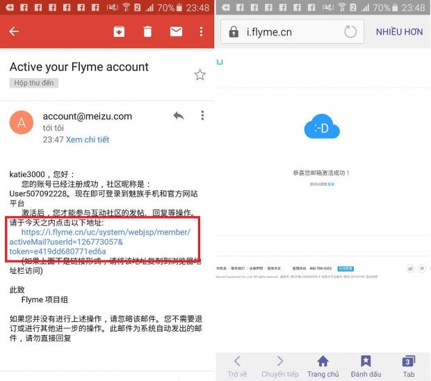 Đến đây thôi chưa đủ, Meizu sẽ gửi một email đến địa chỉ mail mà bạn đã đăng ký nhằm xác thực tài khoản, đây là bước khá quan trọng. Thư xác nhận sẽ được gửi đến trong 5 phút, công việc của bạn rất đơn giản truy cập vào đường link đính kèm. Như vậy là hoàn thành các bước cài đặt Flyme ID.