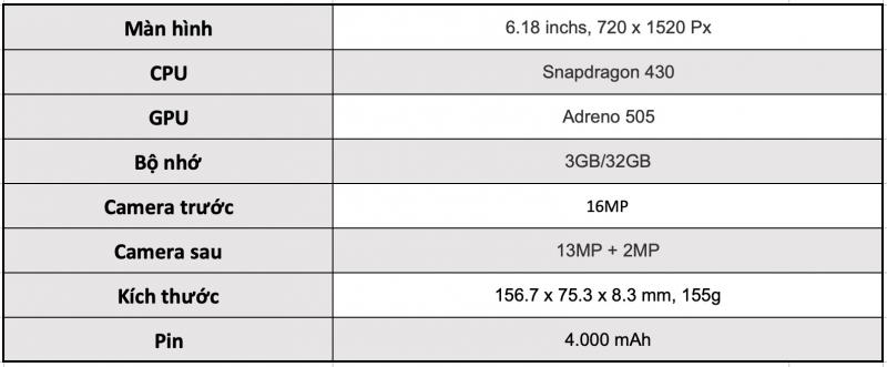 Về cấu hình, Joy 1+ được trang bị con chip Snapdragon 430, 3GB RAM cùng 32GB bộ nhớ trong. Không nổi bật nhưng cũng đủ đáp ứng các nhu cầu sử dụng cơ bản. Chi tiết cấu hình các bạn có thể xem thêm bảng cấu hình bên dưới: