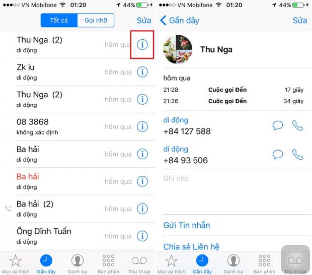 Các bạn nên nhớ rằng, để xem thông tin về lịch sử cũng như số điện thoại của một tên danh bạ nào đó, các bạn hãy bấm biểu tượng chữ 'i' phía sau nhé!