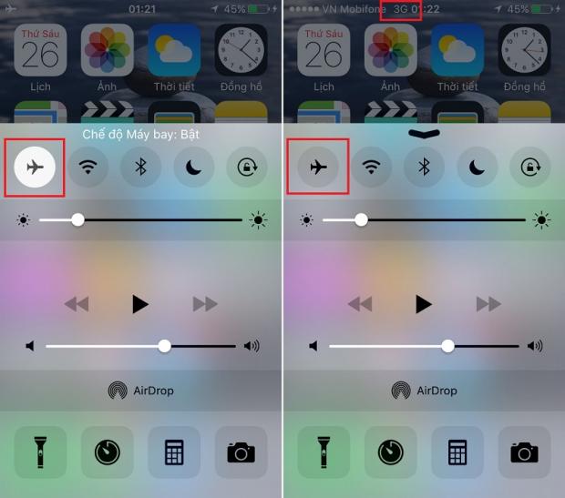 Nhưng thật sự là các bạn không cần khởi động lại iPhone, có một cách đơn giản hơn rất nhiều đó là vuốt từ dưới lên để mở Action Center và bấm vào hình máy bay để bật Chế độ máy bay xong tắt đi. Lúc này, biểu tượng 3G sẽ hiện lên và bạn đã có thể sử dụng.
