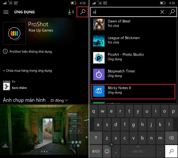- Các bạn bấm vào biểu tượng tìm kiếm và tìm một ứng dụng miễn phí bất kì, VD: Sticky Notes 8