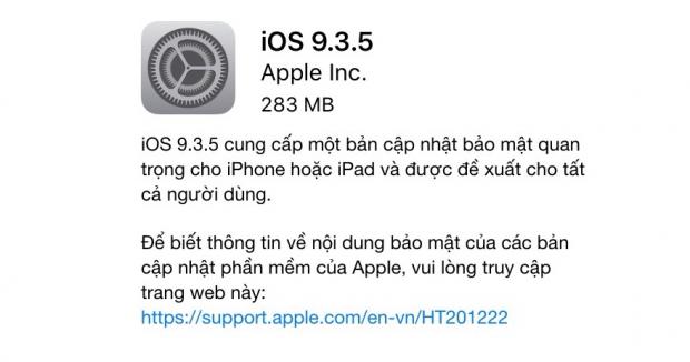 Ngay sau khi tung phiên bản iOS 9.3.4 để khắc phục lỗ hổng cho phép thực thi mã tùy ý với quyền bảo mật cách đây không lâu, hôm qua Apple lại tiếp tục tung ra bản cập nhật iOS 9.3.5 để vá những lỗi bảo mật còn nghiêm trọng hơn thế.