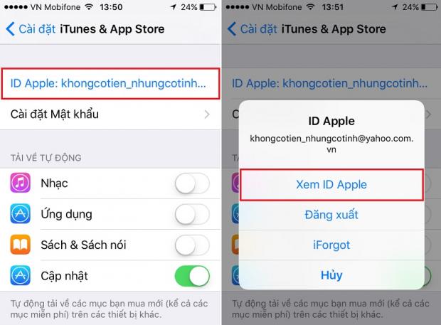 Vào Cài đặt > iTunes & Appstore > bấm vào Apple ID > Xem Apple ID.