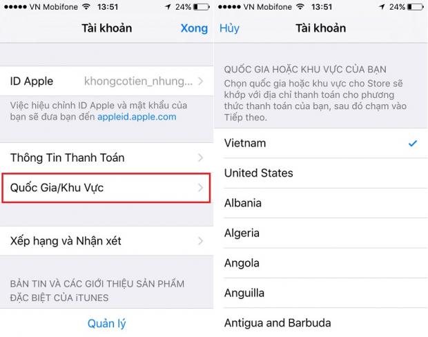 Tại đây, các bạn bấm vào Quốc gia/ Khu vực > chọn Quốc gia mà mình muốn thay đổi và tiếp tục điền một số thông tin như hướng dẫn là xong.