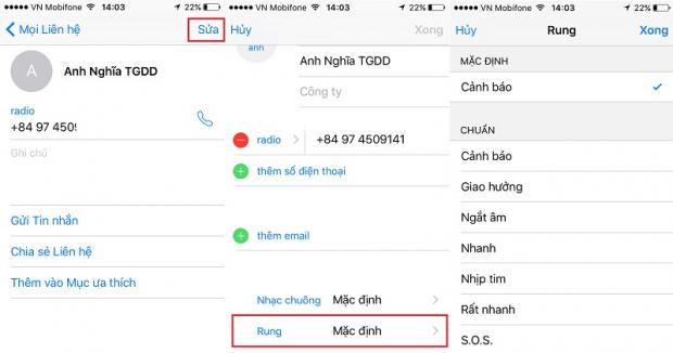 Các bạn vào Danh bạ > Chọn tên một người > bấm vào Sửa >tại mục Rung các bạn bấm vào Thay đổi và lựa chọn một kiểu mà mình thích.