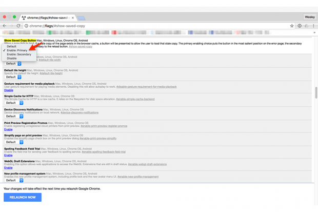 Sau khi đã thiết lập xong, bạn nhấn Relaunch Now để khởi động lại trình duyệt. Để xác nhận xem tính năng này hoạt động hay chưa, bạn có thể tắt kết nối mạng chọn History rồi click vào một đường liên kết ở mục Recently Closed để mở lại trang web mà bạn từng xem. Sau khi đã mở lại trang web mà bạn từng xem, giao diện trang web sẽ thông báo rằng không có kết nối mạng.