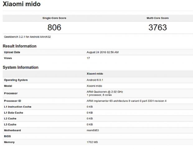 Sau khi giới thiệu chiếc Redmi Note 4, chạy chịp Helio X20 thì tiếp tục một sản phẩm khác của Xiaomi xuất hiện với thông số cấu hình gần như đầy đủ. Chiếc điện thoại bí ẩn này có tên gọi là Mido, máy được trang bị bộ vi xử lý Snapdragon 625, 8 nhân xung nhịp 2.0 GHz, RAM 2GB. Với thông số trên, Xiaomi Mido đạt được 806 điểm đơn nhân và 3763 điểm đa nhân khi đo bằng phần mền Geekbench. Xiaomi Mido sẽ được cài đặt sẵn Android 6.0.1