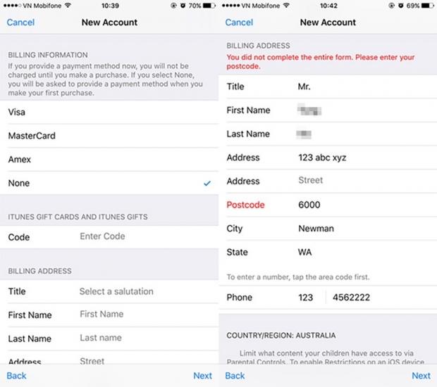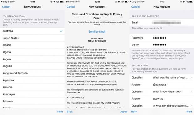 Bước kế tiếp, sau khi đã chọn quốc gia và tải về một ứng dụng miễn phí ngẫu nhiên, Apple sẽ yêu cầu bạn tạo tài khoản mới, hãy làm theo yêu cầu.