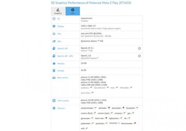 Ngoài ra, Moto Z Play có 3GB dung lượng RAM và 32GB bộ nhớ trong chưa rõ có thể mở rộng thêm hay không. Các thử nghiệm benchmark GFXBench cũng cho thấy máy có camera 16MP ở phía sau và 5MP ở phía trước. Dung lượng pin 3500mAh, máy quét vân tay và Android 6.0.1 sẽ được trang bị lên sản phẩm này.