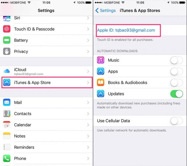 Trên iPhone, iPad, bạn vào Settings (Cài đặt) > iTunes and App Store và bấm vào tên tài khoản của mình để tiến hành thiết lập.