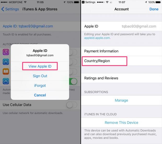 Tiếp theo, bạn chọn View Apple ID > Country/Region (Quốc gia/Vùng)