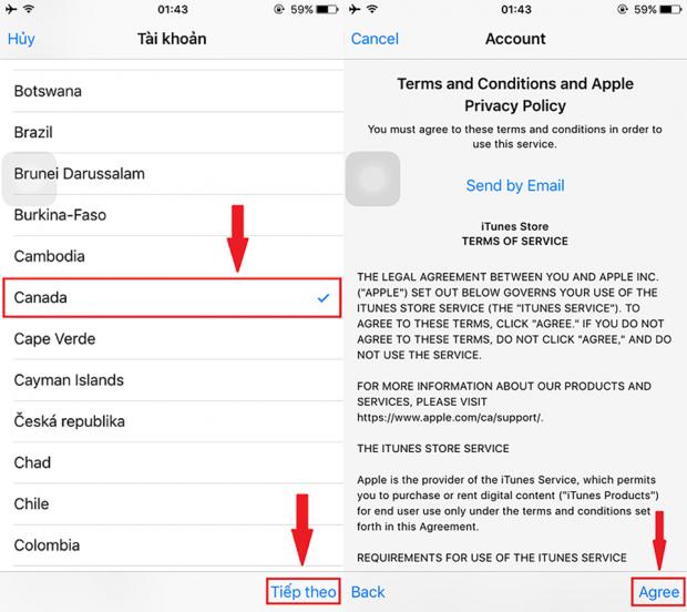 Chọn quốc gia có ứng dụng bạn cần và bấm “Tiếp theo”, tiếp tục chọn “Agree” (Đồng ý).