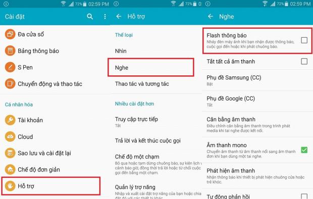 Trên các máy của Samsung, bạn hoàn toàn có thể bật tính năng này bằng các vào Cài đặt > Hỗ trợ > Nghe và chọn vào đèn Flash thông báo.