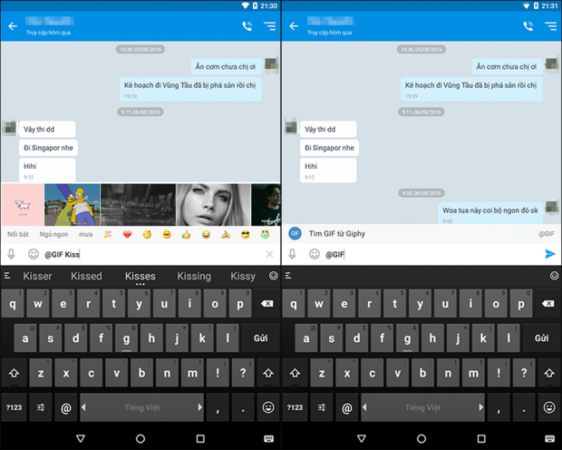 Trước kia, người dùng mỗi khi đăng ảnh động đều phải mở ô ảnh GIF và chọn hình mong muốn, việc này tốn nhiều thao tác khi bạn phải ngắt quãng quá trình nhắn tin. Trong khi đó, giờ đây bạn đã có thể chọn nhanh cho mình một hình ảnh động với nội dung vui vẻ từ kho ảnh GIPHY chỉ với cú pháp @GIF + “từ khóa”, ví dụ như @GIF Kiss. Hơn nữa, bạn có thể dùng các biểu tượng cảm xúc để tìm kiếm các ảnh động nếu như từ khóa không thể diễn tả được chính xác thông điệp mà bạn muốn gửi đi.