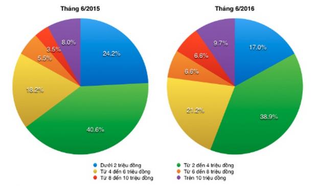 Dù vẫn chiếm tỷ lệ lớn nhất tính đến giữa 2016, 38,9%, phân khúc smartphone tầm 2 đến 4 triệu đồng đã sụt giảm nhẹ khi cùng kỳ 2015 đạt 40,6%. Trái ngược lại, phân khúc smartphone đắt tiền hơn đều có sự tăng trưởng tốt trong thời gian gần đây. Ấn tượng nhất ở tầm giá 8 đến 10 triệu đồng, khi thị phần tăng gần gấp đôi từ 3,5% lên 6,6%. Ngay cả phân khúc cao cấp trên 10 triệu đồng, thị phần cũng nhích từ 8% lên 9,7%.