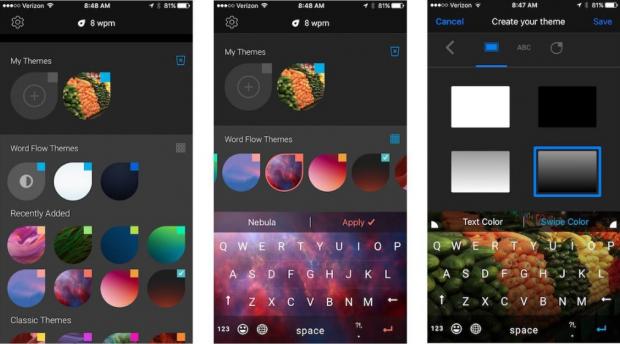 Thay đổi theme bàn phím không còn là tính năng mới mẻ trên Adnroid, nhưng với người dùng iOS thì đây thực sự là một điều tuyệt vời để thay thế sự đơn điệu trong bàn phím truyền thống trên những chiếc iPhone, iPad. Word Flow cung cấp một số chủ đề cho phép bạn có thể tùy chỉnh kiểu bàn phím, màu sắc, khoảng cách giữa các phím hay thậm chí là dùng hình ảnh cá nhân để đặt làm hình nền cho bàn phím để tạo nên một phong cách khác biệt cho riêng mình.