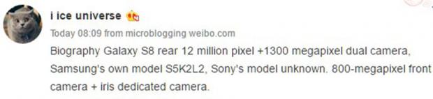 Mới đây, một leaker có tiếng đã tuyên bố trên weibo.com rằng Samsung sẽ trang bị camera kép cho Galaxy S8 mà theo đúng lộ trình sản phẩm nó sẽ ra mắt vào đầu năm 2017. Combo chính xác của cụm camera kép này bao gồm một cảm biến 12MP do Samsung sản xuất giống như trên Galaxy Note 7 và một cảm biến 13MP của Sony. Điều này sẽ giúp cho việc chụp ảnh chuyên sâu ấn tượng hơn và trong nhiều điều kiện ánh sáng khác nhau hình ảnh cũng sẽ chất lượng lơn.