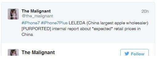 Một tài khoản twitter có tên The Malignant đã tiết lộ mức giá cụ thể cho các phiên bản của iPhone mới cùng với nguồn giá là từ hệ thống bán lẻ sản phẩm Apple thuộc hàng lớn nhất Trung Quốc là LELEDA: