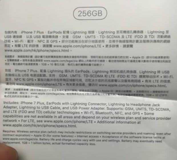 Càng gần ngày ra mắt, thông tin rò rỉ về bộ đôi iPhone 7 và iPhone 7 Plus xuất hiện càng nhiều. Chúng tôi vừa nhận được một hình ảnh chụp tờ giấy đi kèm hộp iPhone 7 Plus, qua đó xác nhận phiên bản 256GB và tai nghe cổng Lightning.