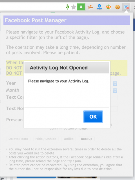 Tiếp theo, truy cập vào Facebook cá nhân và bấm vào biểu tượng Facebook Post Manager ở gióc trên bên phải cửa sổ trình duyệt, ứng dụng sẽ yêu cầu chuyển hướng đến trang thống kê hoạt động (Activity Log), đây là trang thống kê lại toàn bộ tương tác của bạn trên Facebook, ứng dụng sẽ quét dữ liệu tại đây để tiến hành xoá, bạn hãy chọn 'OK'.