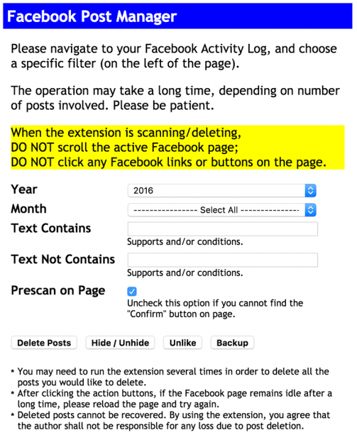 FPM cũng có những khuyến cáo với người dùng rằng khi ứng dụng đang quét và xoá thì tuyệt đối không scroll trang (lướt lên xuống), cũng không được bấm vào bất kỳ link hay nút nào trên trang. Và những post một khi đã xoá sẽ không thể khôi phục được.