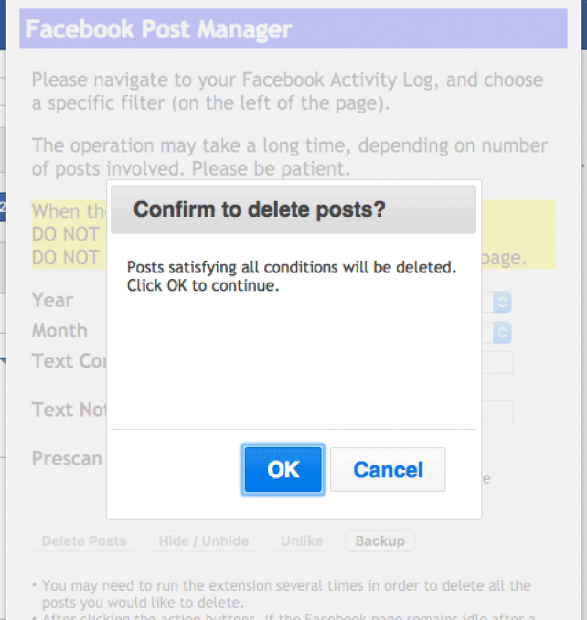 Khi đã chọn xóa hoặc ẩn đi tiện ích Facebook Post Manager sẽ xác nhận liệu bạn có thực sự muốn xóa, ẩn đi hay không bạn chọn “OK” để thực hiện.
