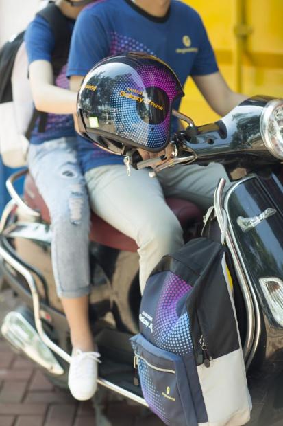 Nón bảo hiểm đúng 'chất'Tiếp đến là chiếc áo thun tím với hoạ tiết tròn đầy lôi cuốn giúp người mặt dễ dàng thu hút mọi ánh nhìn khi lướt trên phố, đặc biệt là khi các cặp đôi cùng diện mẫu áo này. Chiếc ba lô trong bộ quà tặng cũng là 'trợ thủ' không thể thiếu trong những cuộc hành trình dù dài hay ngắn, giúp bảo vệ những món đồ thân yêu của người dùng.