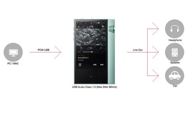 AK70 có thể được sử dụng như một bộ USB DAC, việc đơn giản là kết nối AK70 với PC/Mac thông qua cổng USB. AK70 làm USB DAC hỗ trợ nhạc lên đến 24bit 96kHz, mang lại âm thanh giàu nhạc tính và độ phân giải cao hơn so với các loại DAC tích hợp trên máy tính. Ảnh bên dưới sẽ minh họa rõ hơn cho điều này.