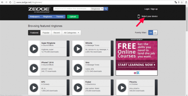 Bước 1: Bạn chỉ cần vào www.zedge.net/ringtones/, tiếp theo chọn Select your device.