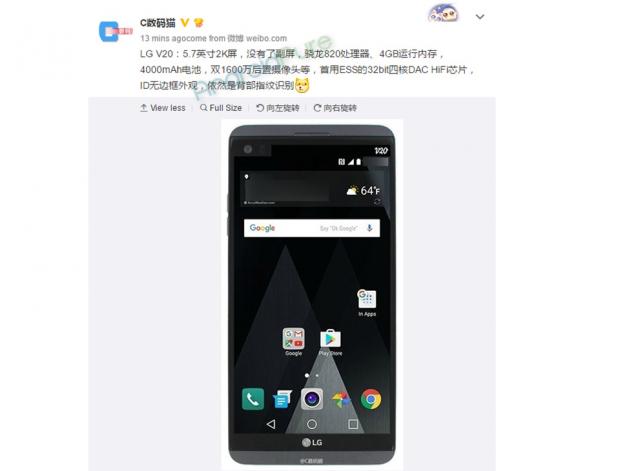 Theo đó, thông số kĩ thuật khá đầy đủ của LG V20 đã được một leaker rất có tiếng trên Weibo đăng tải. Cụ thể, máy sẽ có màn hình có màn hình 5,7 inch Quad HD 2K và được trang bị vi xử lý Qualcomm Snapdragon 820 với 4 GB dung lượng bộ nhớ RAM. Còn về camera, không phải là độ phân giải 21MP như đồn thổi mà ở đây nó được đề cập là dùng camera kép 16MP ở phía sau. Ngoài ra, dung lượng pin 4.000 mAh và chip 32-bit Hi-Fi Quad DAC để xử lý âm thanh riêng biệt cũng được cho là có mặt trên LG V20.