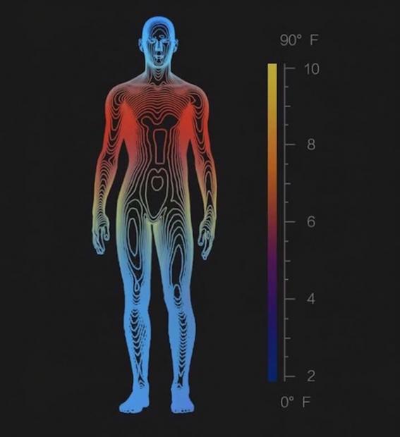 Bạn có thể thấy một bản đồ hình ảnh nhiệt độ của cơ thể con người với thân và cánh tay xuất hiện tình trạng ấm hơn so với các bộ phận khác của cơ thể, đây cũng là vị trí mà một chiếc áo khoác thường bảo vệ.