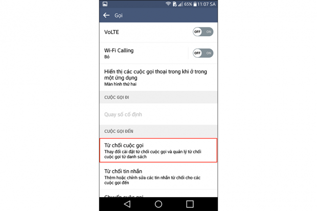 Tại đây, bạn có thấy có hai tùy chọn là “Từ chối cuộc gọi” và “Từ chối tin nhắn”. Ở tùy chọn “Từ chối cuộc gọi”, người dùng có thể thêm số điện thoại bất kì mà bạn muốn chặn. Còn tùy chọn “Từ chối tin nhắn” sẽ cho phép điện thoại của bạn tự động trả lời một đoạn tin nhắn được thiết lập sẵn khi không thể nghe máy. Để chặn cuộc gọi, bạn chọn “Từ chối cuộc gọi”.