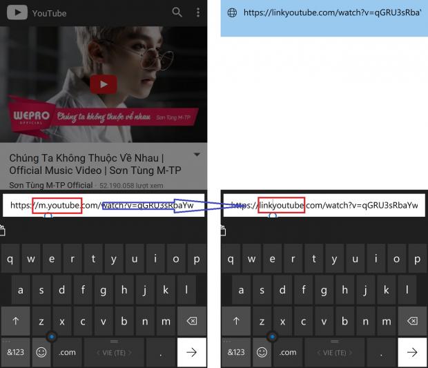 Bước 2: Dưới thanh địa chỉ bạn để ý 'm.youtube......' > Các bạn thay 'm.' thành 'link'.