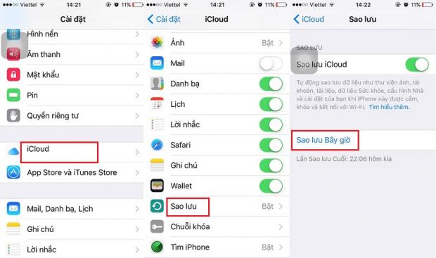 Bước 2: Bạn truy cập vào Cài đặt > iCloud > Sao lưu > Sao lưu bây giờ và đợi đến khi quá trình này kết thúc.