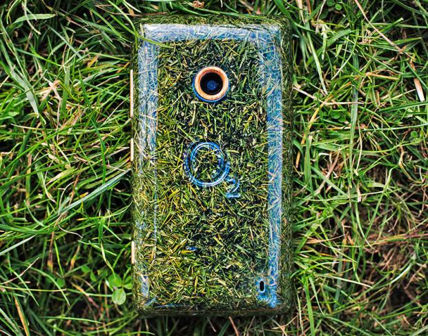 Đúng như cái tên gọi của nó, chiếc điện thoại này sử dụng vở ngoài rất thân thiện với môi trường. Điển hình là phần nắp lưng được làm từ nhựa có khả năng phân hủy, được độn thêm cỏ lấy từ sân vận động Twickenham, tất nhiên loại cỏ này đã được xử lí và ép khô lại rồi nhé.
