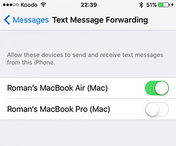 Tiếp theo cũng trong mục Send & Recieve, bạn chọn Text Message Forwarding, iPhone sẽ tự nhận dạng chiếc Macbook nào đang sử dụng cùng tài khoản Apple và hiển thị, bạn chỉ cần bật On thiết bị lên.