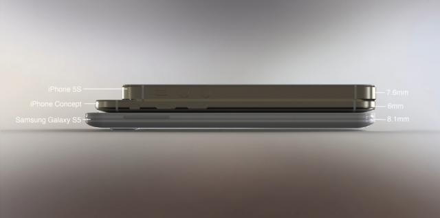 Theo hình ảnh concept iPhone 6 có kích thước nhỏ hơn đáng kể so với Samsung Galaxy S5, iPhone 5S 4inch cũng được đặt cạnh mẫu iPhone 6 để so sánh,