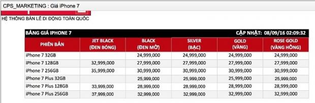 Trong bảng giá này, mức thấp nhất cho một phiên bản 32 GB là 25 triệu và mức cao nhất là bản iPhone 7 Plus 256 GB màu đen bóng, nó có giá lên tới 38 triệu đồng.