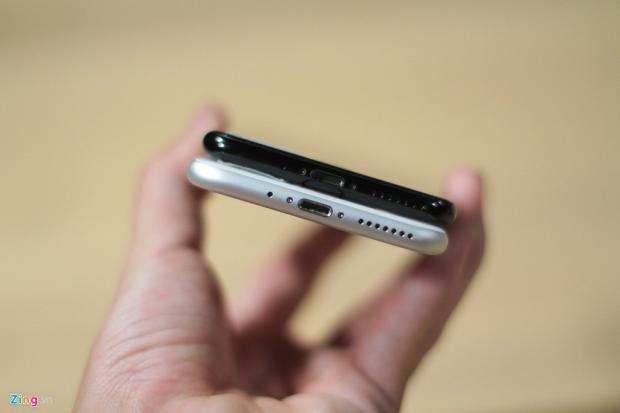 Tuy bỏ giắc cắm 3,5 mm, nhưng iPhone 7 vẫn không mỏng hơn đáng kể so với 6S. Các chi tiết trên phiên bản đen không lộ rõ như phiên bản màu trắng.