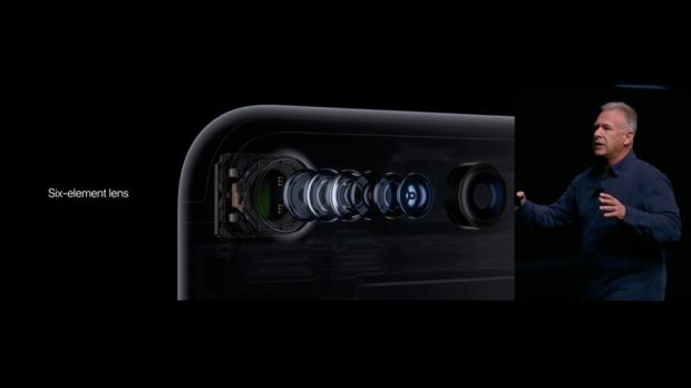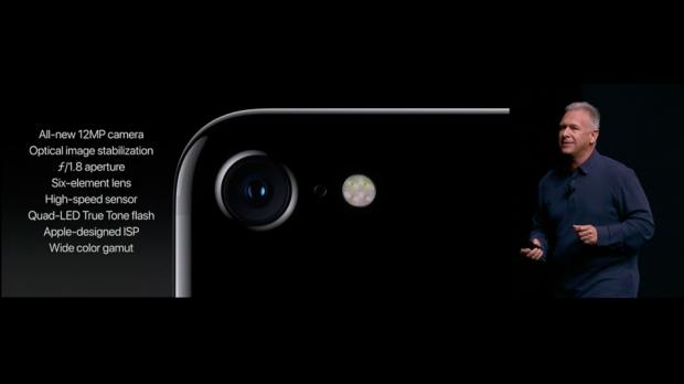 Đây là camera iSight với ống kính gồm 6 thấu kính, cảm biến 12 MP, nó tích hợp tính năng ổn định quang học giống như bản iPhone 6 Plus hoặc 6s Plus trước đây. Cơ chế mới cho phép nó chụp ảnh phơi sáng dài hơn gấp 3 lần so với iPhone 6s.
